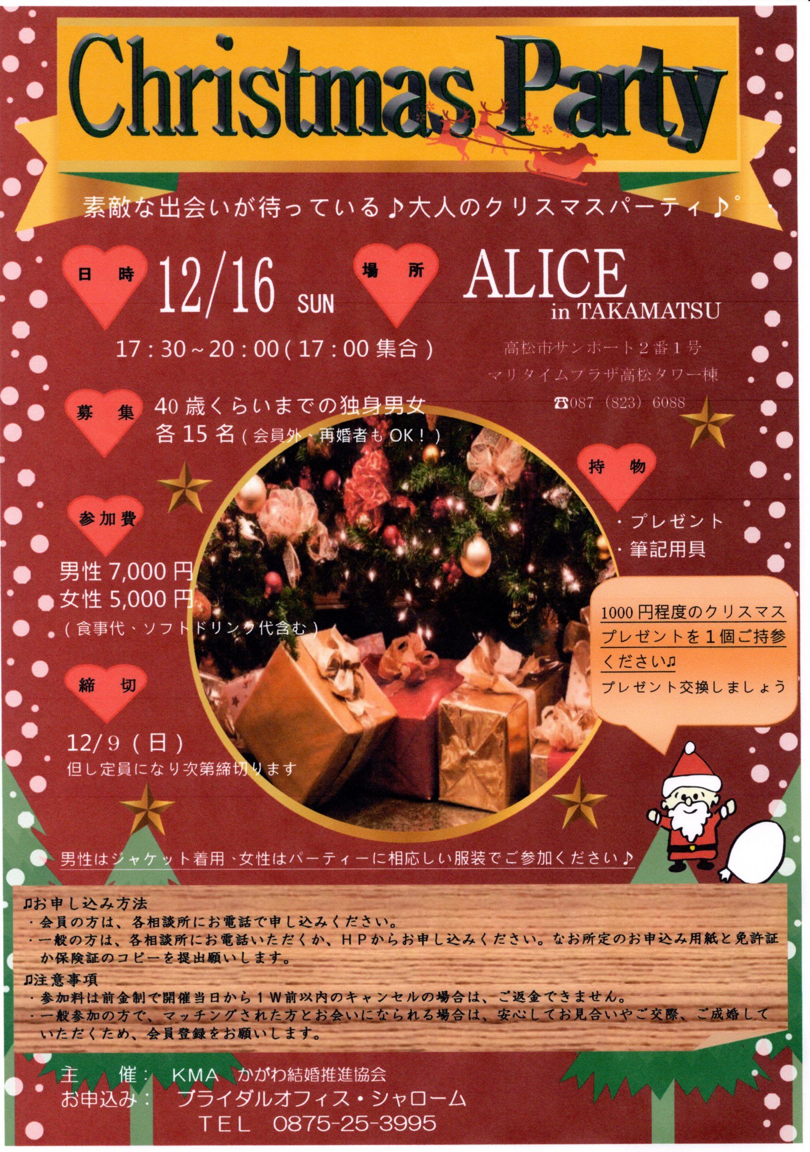 【Christmas Party 2018】 素敵な出会いが待っている♪ 大人のクリスマスパーティー♪ 毎年、好評のクリスマスパーティを今年も開催致します! 日時 12月16日(日)17:30~20:00(17:00集合) 場所 ALICE in TAKAMATU (高松市サ... -
