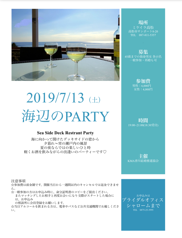 夏風☆彡海風☆彡海辺のカフェでカクテルパーティー 2020/07/12(日) 場所:ミケイラ高松 高松市サンポート8-20 募集:45歳までの独身男女 定員20名(男性10名・女性10名) 一般参加・再婚可 真剣に結婚を考えている方... -